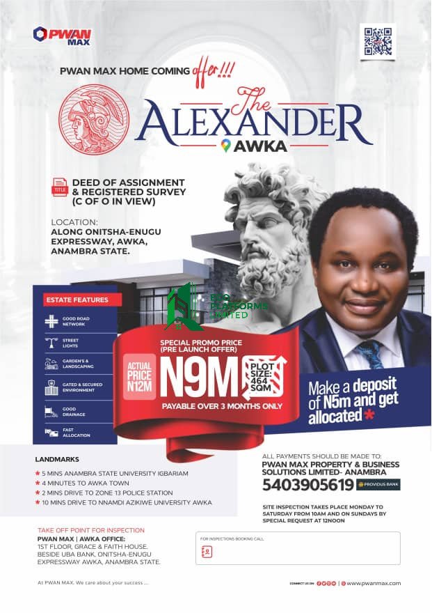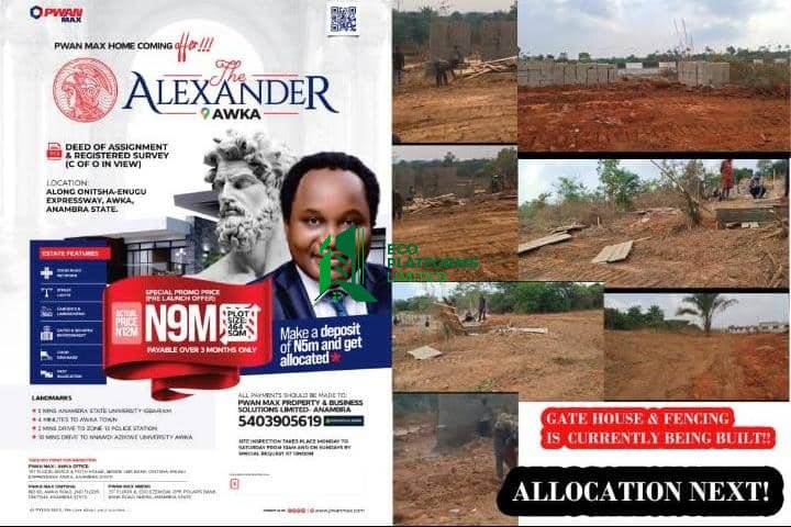 Alexander Estate is specifically behind Nnamdi Azikiwe University (UNIZIK) in Amasea, Awka. It is described as "property like no other", an "epitome of luxury and prime real estate". It's also highlighted for its potential for high appreciation and immediate allocation upon a deposit of 5M. This Estate is promoted as having a strategic location that attracts infrastructural developments and offers a good return on investment. Payable over 3 months.